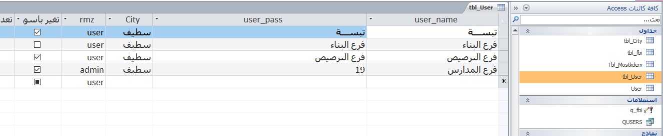 تمت الإجابة متقاعد قام بنشر أغسطس 19, 2022 تمت الإجابة قام بنشر أغسطس 19, 2022 32 دقائق مضت, بلال اليامين said: اخي مازال عند اضافة مستخدم كلمة المرور هي اسم المستخدم جرب المرفق 1731391564_(2).accdb