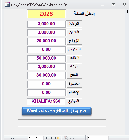 Taher DZ قام بنشر منذ 2 ساعات الكاتب قام بنشر منذ 2 ساعات منذ ساعه, kkhalifa1960 said: تفضل المرفق بعد التعديل بطلبك 4 اماكن مختلفة . طالع كود الاكسس ومستند الوورد شكرا استاذ ظريقة سهلة جدا ونقلت القيم لأماكنها المخصصة في الورد كما صمم لها ملاحظة : احببت طريقة ProgressBar فوجدت بها مشكلة عند الصورة