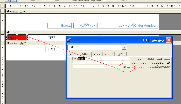 عندي استعلام اسمه OrderQuery وقد تم عمل حقل في هذا الاستعلام هو expr1 وهو يمثل مبلغ الطلبية ، طيب