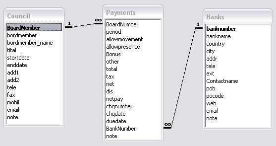 علاقة تربط بين رقم البنك في جدول الدفعات وبين رقم البنك في جدول البنوك .
